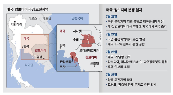 - 25~26일 전투 격화: 학교 폭격, 민간인 피해 확산, 태국 일부 지역 계엄령 선포