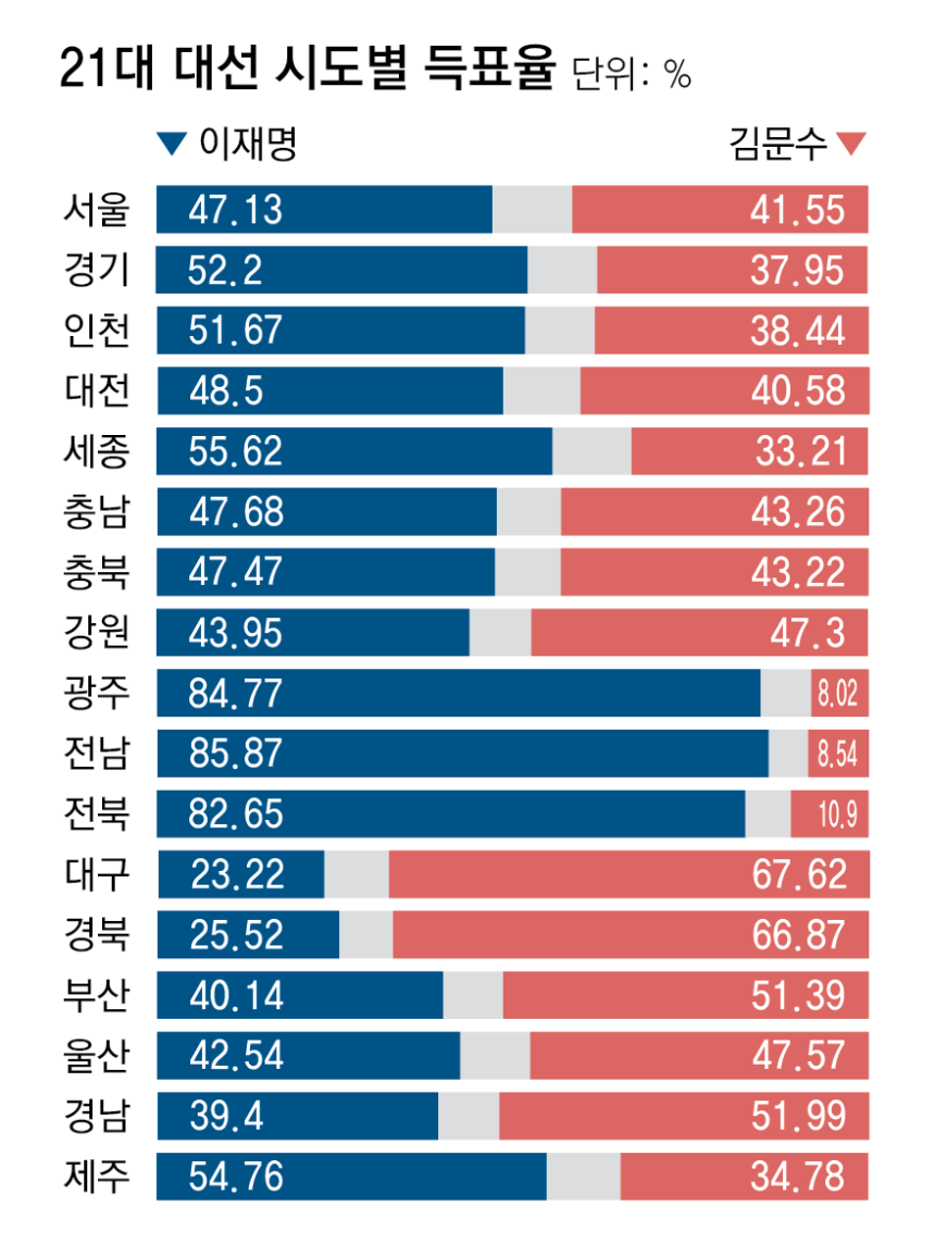 이재명 대통령은 PK·TK(부산·울산·경남, 대구·경북) 지역에서 패했지만,