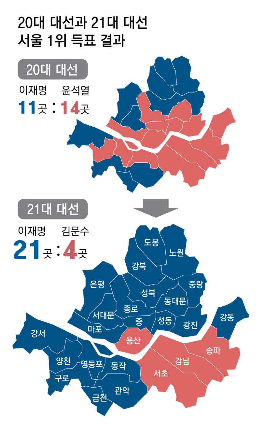 서울 25개 자치구 중 강남3구(서초·강남·송파)와 용산구를 제외한 21곳에서 이 대통령이 승리했습니다.