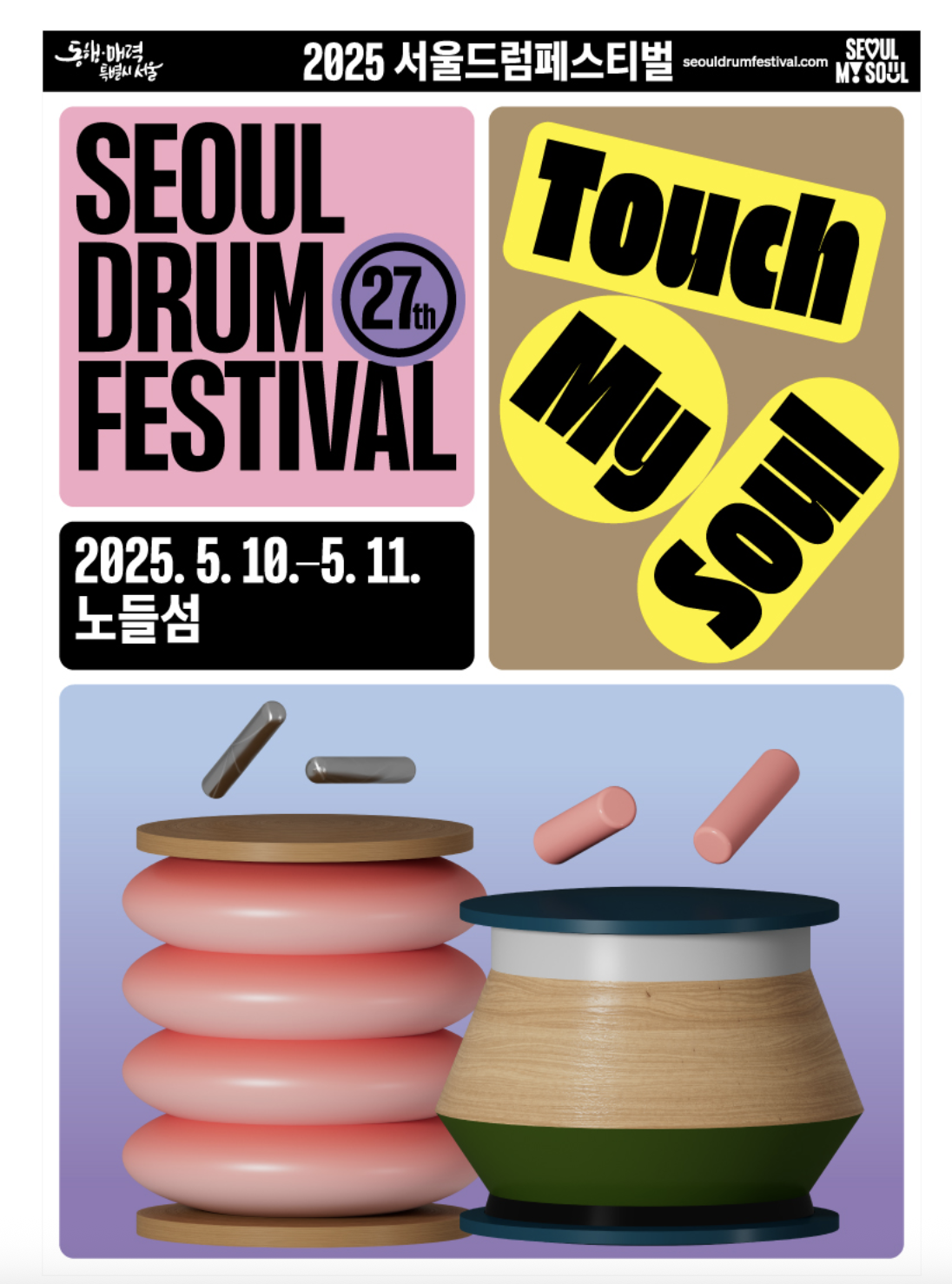 서울시는 1999년부터 이어온 ‘서울드럼페스티벌’을 2025년 5월 10일(토)~11일(일)까지 노들섬에서 개최합니다. 올해 슬로건은 ‘TOUCH MY SOUL’로, 세계적인 드럼 아티스트들의 공연과 시민참여 프로그램이 어우러진 대규모 종합 예술축제입니다.